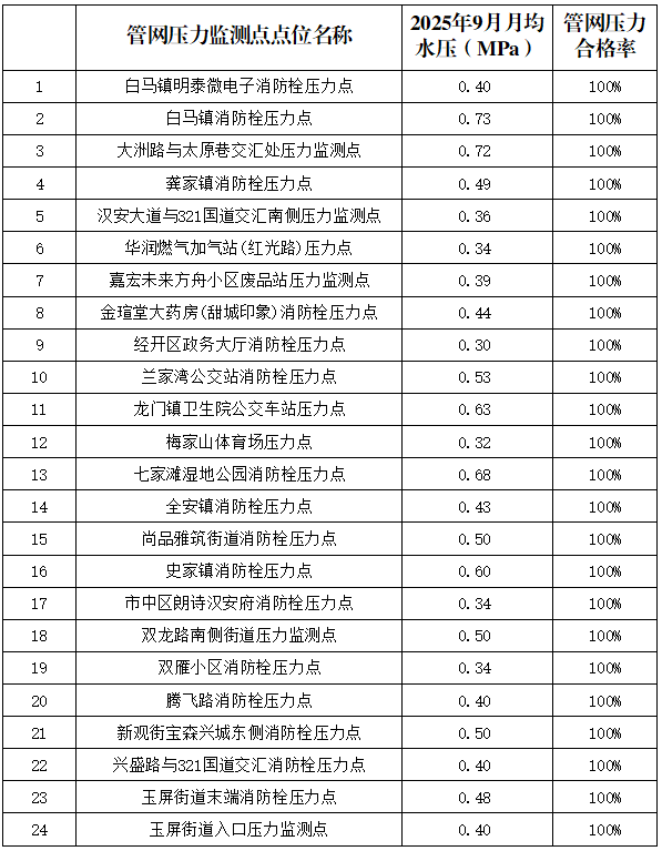 內江市水務有限責任公司2025年9月管網壓力月報